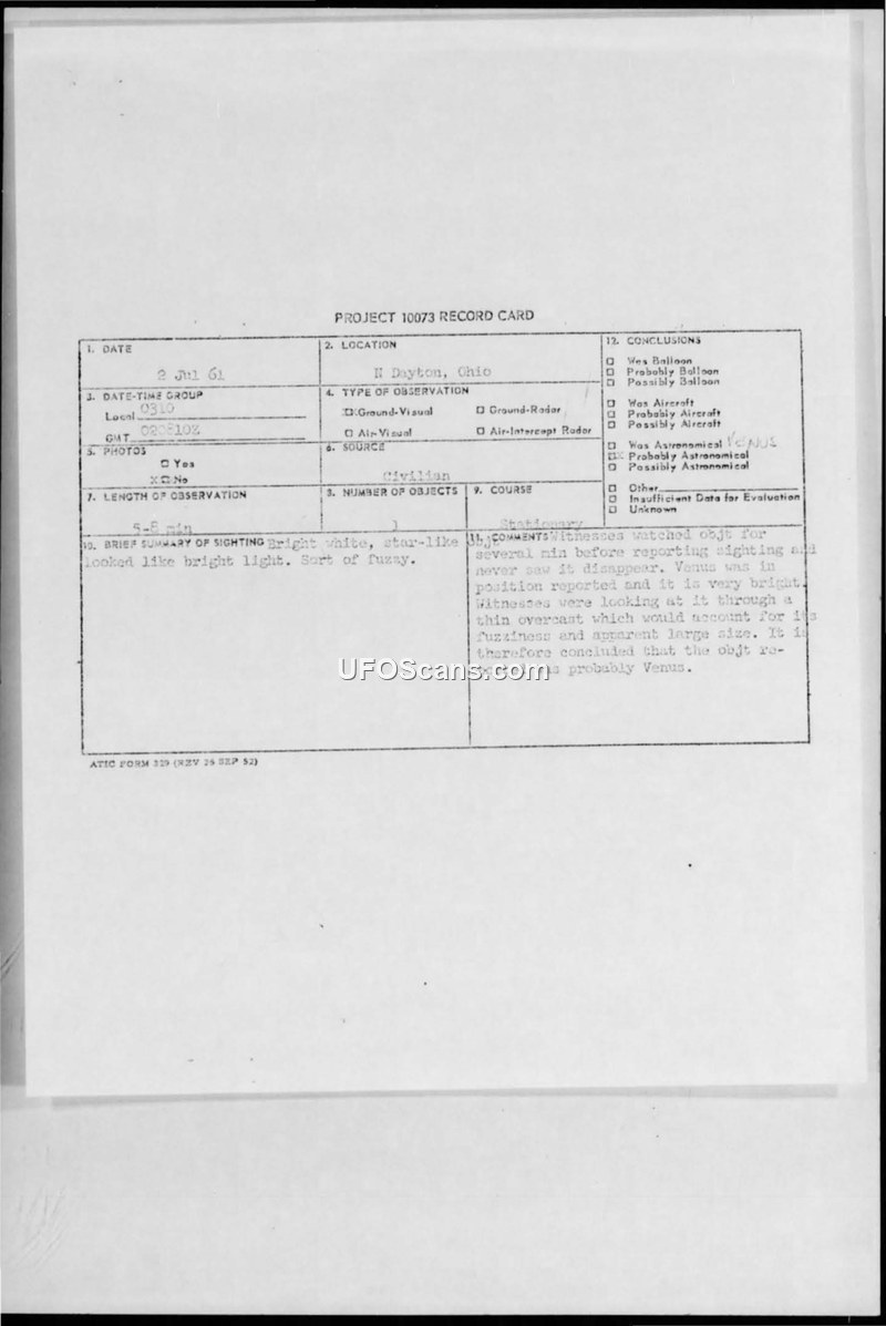 A civilian in Dayton, Ohio, reported a stationary, bright, fuzzy object on July 2, 1961. The Air Force investigation concluded the object was the planet Venus, obscured by a thin overcast.