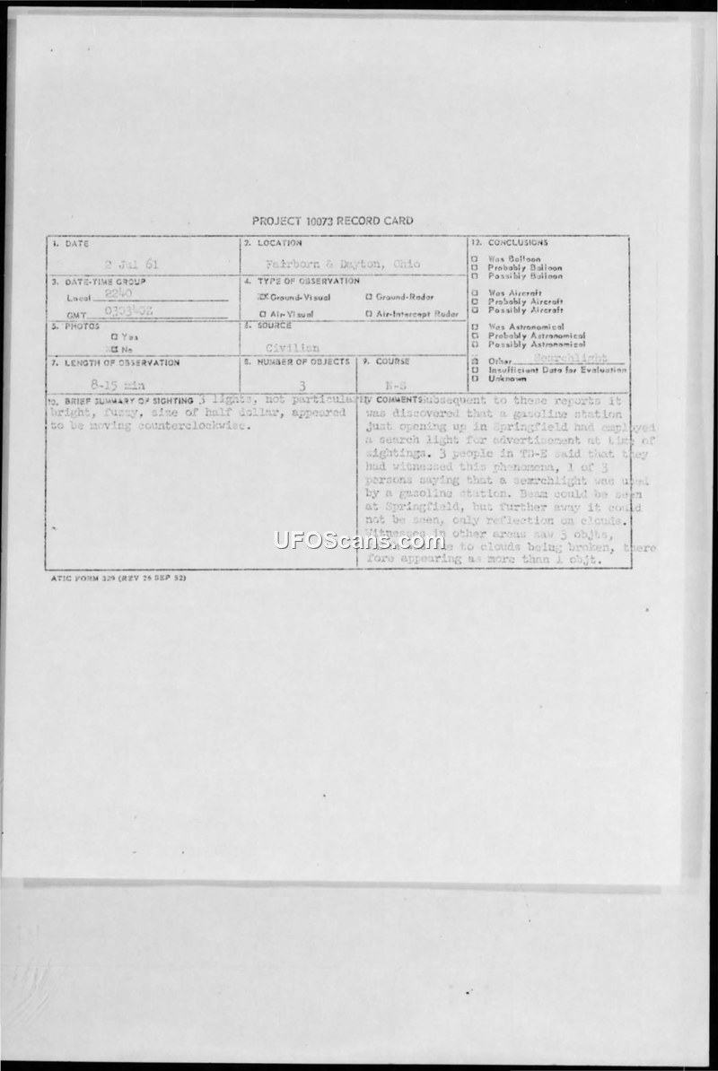 This document consists of a collection of reports and a Project 10073 record card regarding a series of sightings on July 2, 1961, in the vicinity of Fairborn and Dayton, Ohio. Multiple witnesses reported observing three bright, fuzzy, white lights, approximately the size of a half-dollar, moving in a counterclockwise motion. The objects were described as oval-shaped and moving from North to South. Witnesses estimated the altitude at a 45-degree angle and described the speed as faster than a jet. The sightings occurred under conditions of thick or heavy clouds. The investigation, documented by Major Michael J. Stroff, Jr., of the Air Technical Intelligence Center (ATIC), involved coordination with the 376th Command Post at Lockbourne AFB and reports from other residents. A key finding emerged that a gasoline station in Springfield had recently opened and was utilizing a searchlight for advertising purposes. It was determined that the reported phenomena were actually reflections of this searchlight on the cloud cover. The reports were consolidated into a summary by the duty officer, noting that the sightings were not considered to be of an unidentified aerial nature once the source of the light was identified.