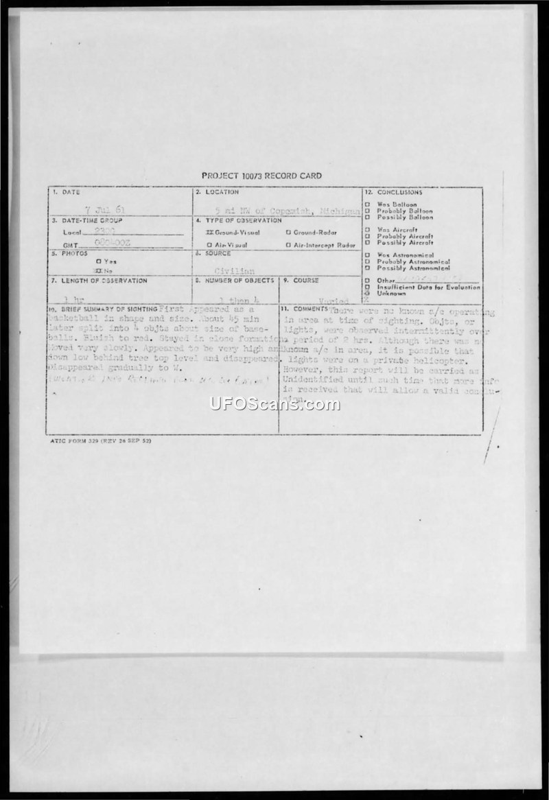 A series of UFO sightings near Copemish, Michigan, on July 7, 1961, involving multiple witnesses and objects. Military authorities confirmed no known aircraft were in the area, and the case remained officially unidentified.