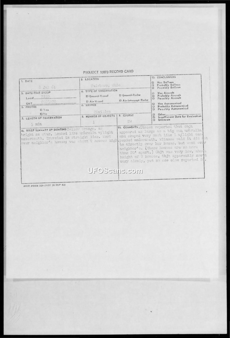 This document contains a series of Project 10073 record cards and U.S. Air Force Technical Information Sheets documenting multiple UAP sightings in Fairborn, Ohio, during July 1961. The reports detail civilian observations of aerial objects, including one described as a 'yellow-orange' object that looked like an 'umbrella' and another described as a 'white light' that moved erratically. Witnesses provided detailed accounts of their observations, including the duration of the sightings, the weather conditions, and their own estimations of the objects' behavior. One specific report involves a witness observing a 'dark object on the sun' for 20 minutes using binoculars. The Air Force investigation into these incidents consistently concluded that the objects were likely high-flying jet aircraft operating in the vicinity of Wright-Patterson Air Force Base (WPAFB). The analysts noted that while the witnesses described unusual maneuvers, such as zig-zagging or non-linear flight paths, the presence of jet aircraft in the area was common, and the observed phenomena were consistent with aircraft running lights or other standard aviation activity. Regarding the 'dark object on the sun,' the analyst contacted the witness and confirmed that the witness had also consulted a planetarium in Dayton, which identified the phenomenon as an explosion on the sun. The documents reflect the standard procedure for processing UAP reports during this period, emphasizing the collection of witness testimony and the subsequent evaluation by ATIC personnel to determine if the sightings could be explained by conventional aircraft or astronomical events.