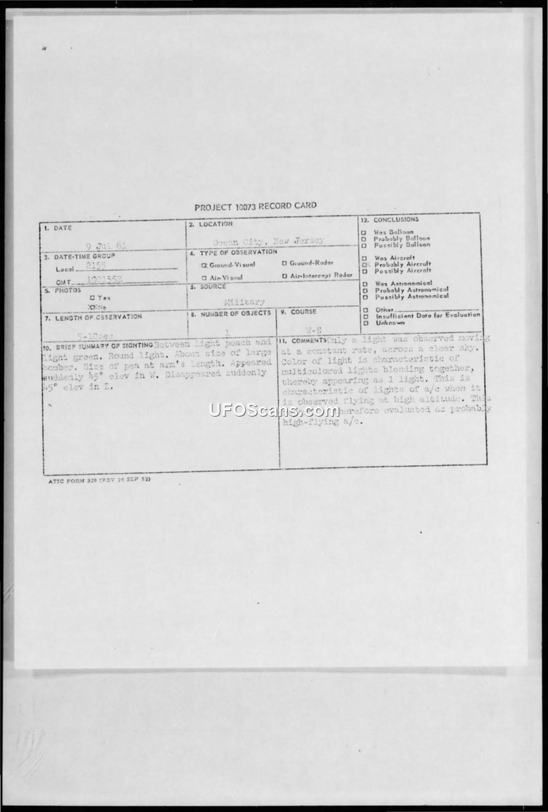 Project 10073 Record Card — Sighting in Ocean City, New Jersey, 9 July 1961