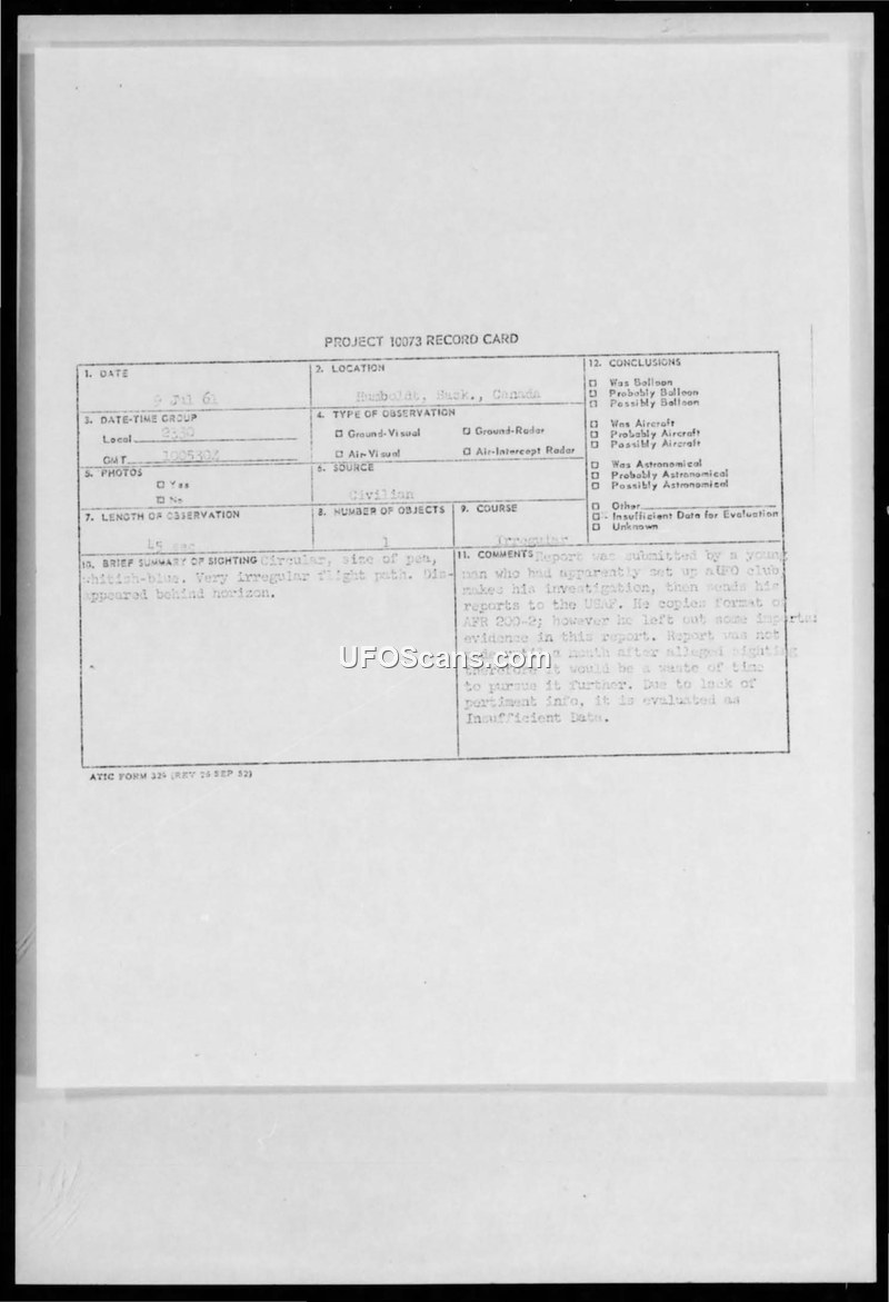 A 1961 UFO sighting report from Humboldt, Saskatchewan, was dismissed by the USAF as having insufficient data. The investigator noted the witness was a student who had formed a UFO club and submitted the report too late for effective analysis.