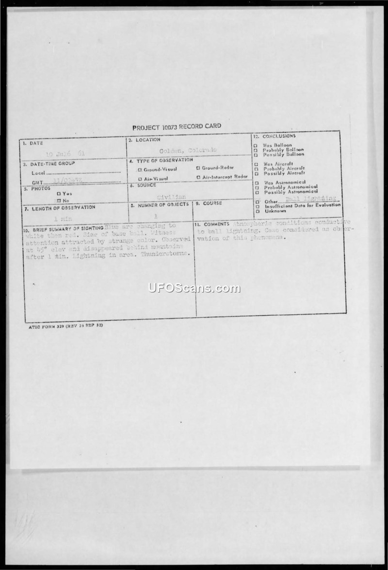 A former Air Force pilot reported a blue, white, and red baseball-shaped object in Golden, Colorado, on July 11, 1961. The Air Force concluded the sighting was likely ball lightning due to local thunderstorm activity.
