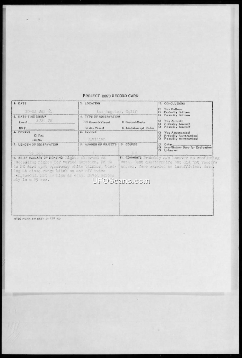 A civilian reported a soundless, fast-moving light in Los Angeles in July 1961. The Air Force determined the report lacked sufficient data and requested further information from the witness to distinguish the object from aircraft or satellites.