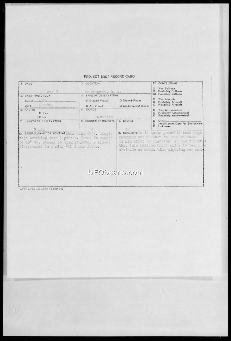 A civilian in Washington, D.C. reported a star-like object breaking into pieces on July 11, 1961. The Air Force concluded the event was likely a bursting weather balloon.