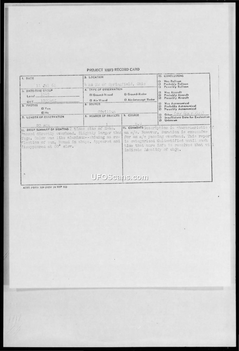 Project 10073 Record Card — 11 July 1961 Sighting, Springfield, Ohio
