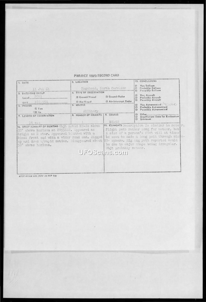 Project 10073 Record Card — Nagshead, North Carolina, 11 July 1961