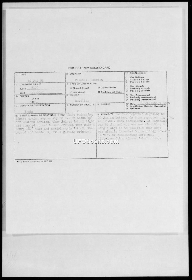 This document collection contains records and correspondence regarding two UFO sightings reported in Palatka, Florida, during the summer of 1961. The primary witness, a 14-year-old amateur astronomer and high school student, submitted detailed accounts of objects observed on June 29 and July 25, 1961. In the first report, the witness described two blue-white pulsating lights moving across the sky, which joined into a single light, turned crimson red, and performed sharp 180-degree turns at high speeds. The witness estimated the object's speed at 1,000 MPH and its altitude at 30,000 feet, noting that it made no sound. A second report, dated July 25, described four flying objects that converged into one, changed color from blue-white to orange, and disappeared behind trees. The Air Force, specifically the Foreign Technology Division and the Aerospace Technical Intelligence Center, requested additional information from the witness to clarify these accounts. However, internal Air Force correspondence indicates that the reports were ultimately dismissed as unreliable. Major Robert J. Friend and the evaluating committee concluded that the sightings were likely a prank orchestrated by local youths. The committee noted that the reported behavior—specifically the objects separating and joining together—did not conform to known flight patterns and bore similarities to other 'French sightings' that had been previously investigated. The file includes the original Project 10073 record cards, the witness's completed technical information sheets, hand-drawn sketches of the objects' paths, and official letters from the Department of the Air Force requesting further documentation. The final assessment categorized the reports as 'Other' and 'Unreliable Report,' citing inconsistencies and the likelihood of a hoax.