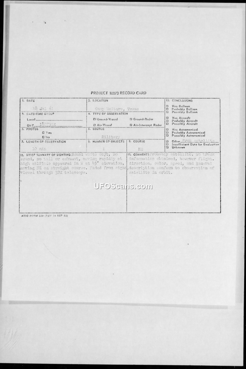 A 1961 sighting of a round, white object at Camp Wolters, Texas, was investigated by ATIC. The object was officially concluded to be a probable satellite.