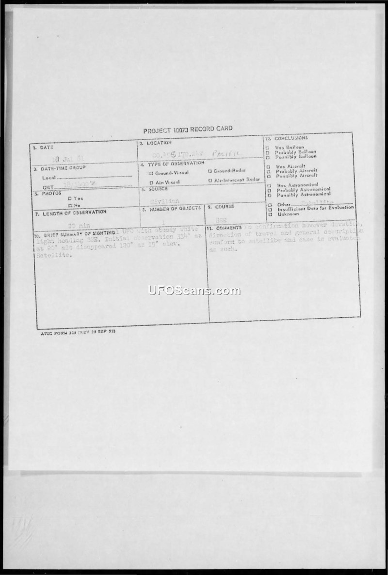 A report of a steady white light observed in the Pacific on July 18, 1962, by an RCA Radio employee. The Air Force evaluated the sighting as a satellite based on its flight path and characteristics.
