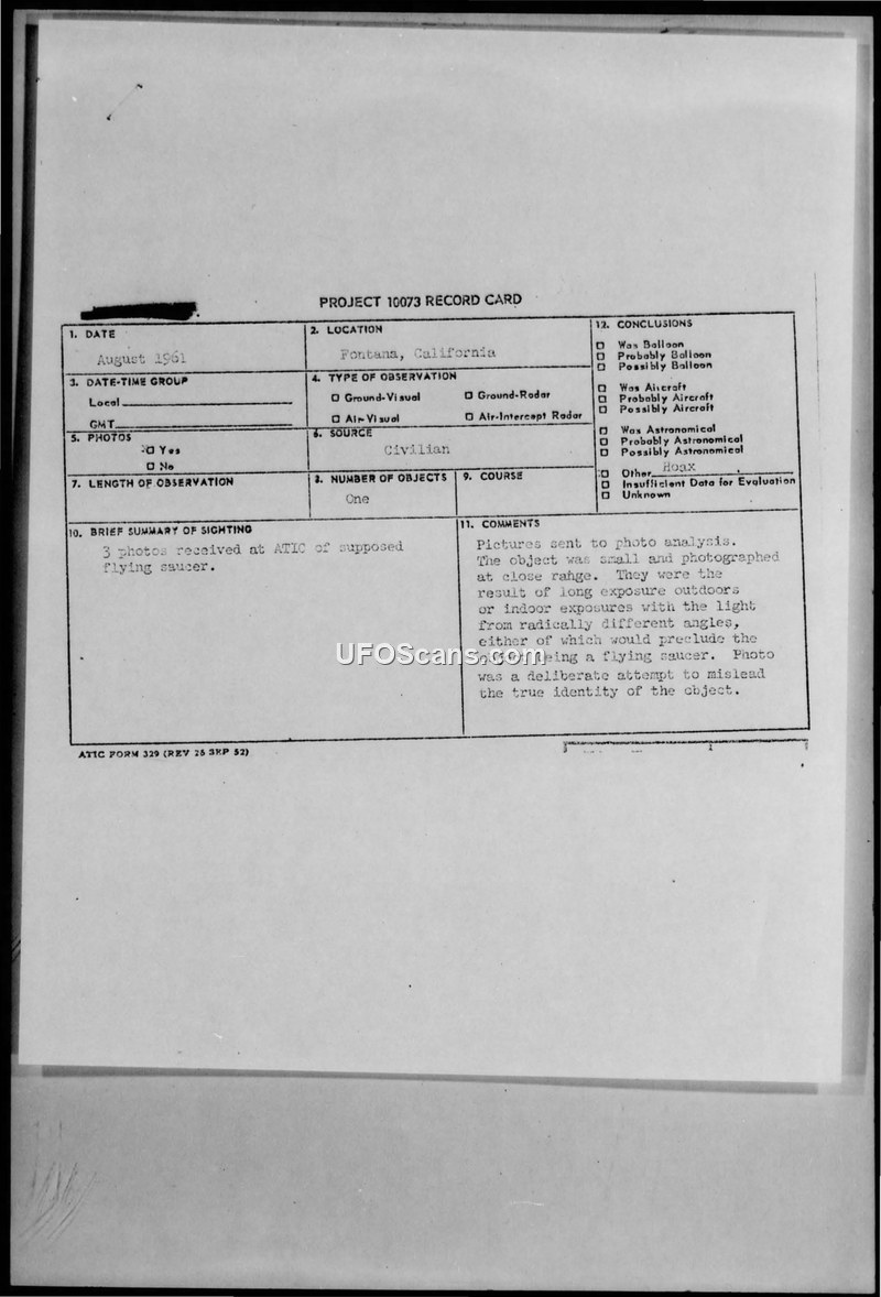 This document collection details the investigation of three photographs submitted by a civilian in Fontana, California, in August 1961. The individual claimed the images depicted a flying saucer. The photographs were forwarded to the Air Technical Intelligence Center (ATIC) and subsequently analyzed by the Foreign Technology Division (FTD) of the Air Force Systems Command. The analysis process involved multiple internal memoranda between Major Friend, Major William T. Coleman, Jr., and the Photo Exploitation Division. The analysts determined that the object in the photographs was small and had been photographed at close range. A critical finding was that the light source in the images appeared to come from radically different angles across the three photos. The analysts concluded that this inconsistency, combined with the nature of the exposures, indicated that the images were either the result of long outdoor exposures or indoor photography. Consequently, the official conclusion reached by the Air Force was that the photographs were not of an unidentified aerial phenomenon, but rather a deliberate attempt to perpetuate a hoax. The file includes the original project record card, internal routing memoranda, and a final letter from Major William T. Coleman, Jr., to the civilian claimant, returning the photographs and stating that the object was small and that the focus was not fine, resulting in missing details.