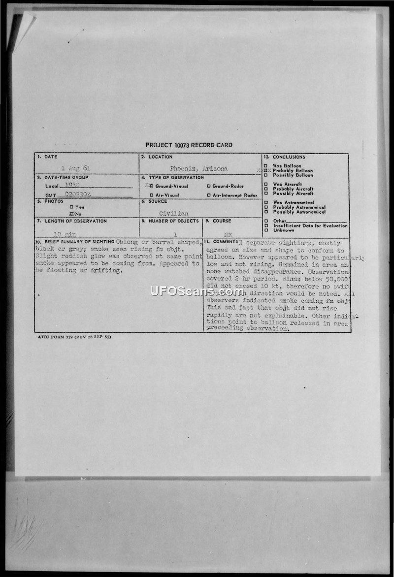 Project 10073 Record Card and Incident Report — Phoenix, Arizona, 1 August 1961