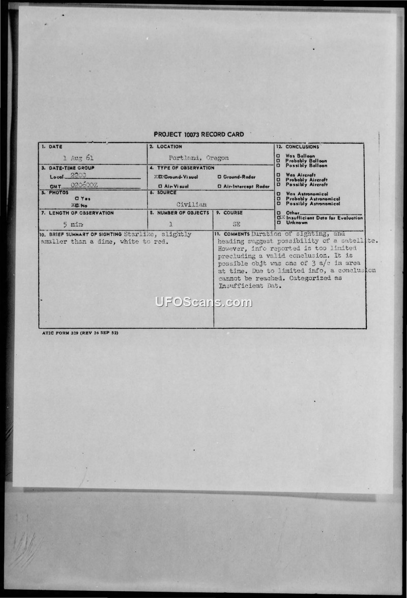 A 1961 UFO sighting report from Portland, Oregon, involving a starlike object observed by four witnesses. The investigation concluded there was insufficient data to identify the object, though satellites or aircraft were considered as possibilities.