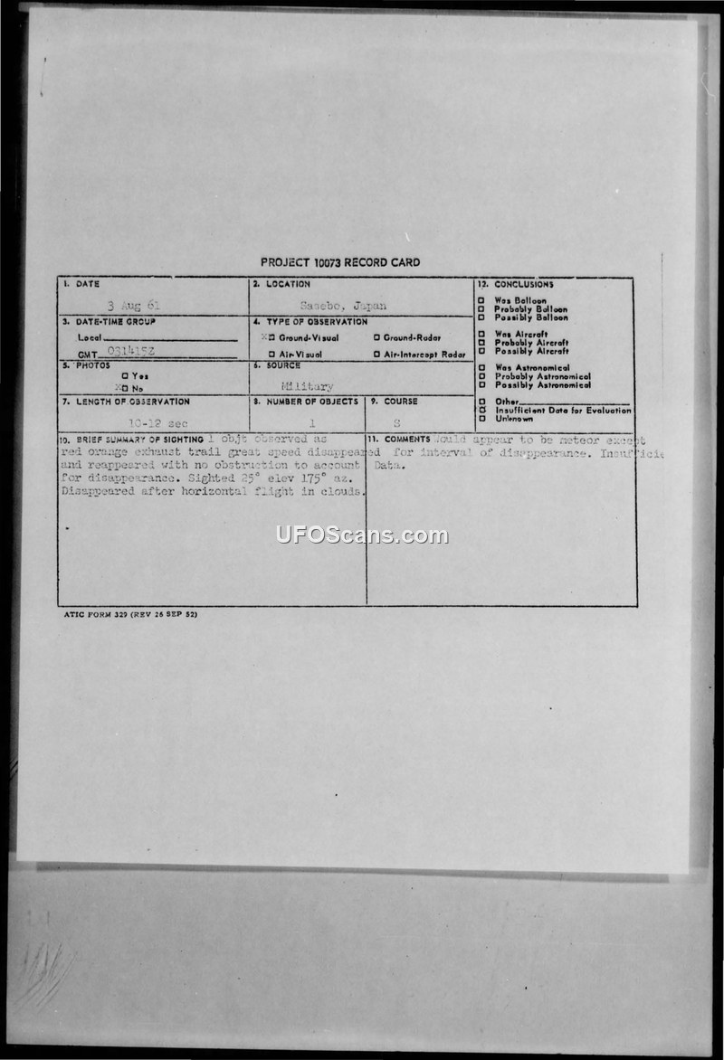 A naval report detailing a 1961 sighting of a fast-moving, red-orange object with an exhaust trail over Sasebo, Japan. The official conclusion was that there was insufficient data to identify the object, though witnesses suggested it resembled a rocket.