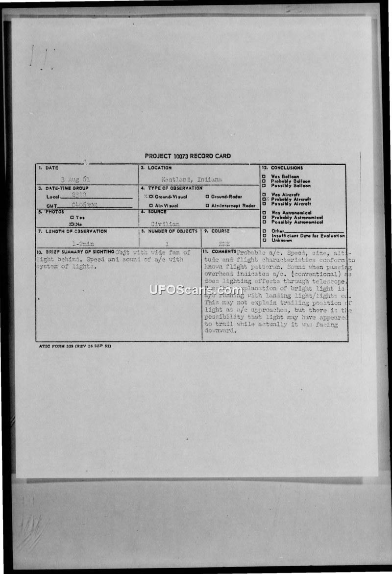 On August 3, 1961, a 19-year-old civilian in Kentland, Indiana, reported observing an unidentified aerial phenomenon while sitting in his backyard with a friend. The witness, who had completed a semester of astronomy at Indiana University, was using a small telescope to watch for the Echo I satellite when he noticed an object approximately 45 degrees above the horizon. Initially, the object appeared to be a comet with a bright nucleus and a wide fan of light behind it. However, upon focusing his telescope on the object, the witness realized it was not a comet but rather an object with a system of lights and an audible sound, which he described as similar to an airplane. The object moved in an East-North-east direction at approximately the speed of a plane. A notable aspect of the sighting occurred after the object passed the zenith; the witness reported that the direction of the 'tail' or 'fan' of light changed, appearing to be directly in front of the object, similar to the headlights of a car. The witness, who was familiar with the appearance of airplanes at night due to the proximity of Kentland to flight paths from Chicago, felt compelled to report the sighting because the object was 'so much out of the ordinary.' The report was forwarded by the Air Defense Command to the Foreign Technology Division at Wright-Patterson Air Force Base. In a follow-up letter dated September 5, 1961, the Foreign Technology Division informed the observer that his report did not contain sufficient information to reach a valid conclusion and requested that he complete additional forms to assist in their evaluation. The documentation includes the original Project 10073 record card, the observer's detailed narrative, and official correspondence between the Air Defense Command and the Foreign Technology Division.