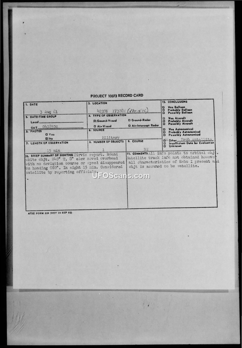 On August 3, 1961, at 040850Z, personnel aboard the USS FORSTER in the Pacific Ocean (42-30N 173-08W) observed an unidentified aerial object. The sighting lasted for approximately 15 minutes. The object was described as a round, white, star-like light, comparable in brightness to a first-magnitude star and appearing the size of a pea. It was first sighted at an elevation of 8 degrees on a bearing of 240 degrees True. The object moved overhead without any deviation in course or speed and eventually disappeared over the horizon on a bearing of 066 degrees True. The observation was made using binoculars by SA V.L. McBeth, USN, and was subsequently confirmed by the Officer of the Deck, the Commanding Officer, and five bridge watch standers. Weather conditions at the time were reported as clear to partly cloudy with a ceiling of 20,000 feet and unlimited visibility. A BARPAC aircraft was in the vicinity at a bearing of 230 degrees and 60 miles away but did not sight the object. Additionally, an unidentified surface contact was noted at 232 degrees, 30 miles away, on a course of 034 degrees at a speed of 18 knots. No electronic countermeasures (ECM) contact was reported by either the BARPAC aircraft or the USS FORSTER. Official analysis conducted under Project 10073 concluded that the object was likely a satellite. Although specific satellite tracking information was not obtained, the reporting officials noted that the object displayed all the characteristics of the Echo I satellite and was therefore assumed to be such.