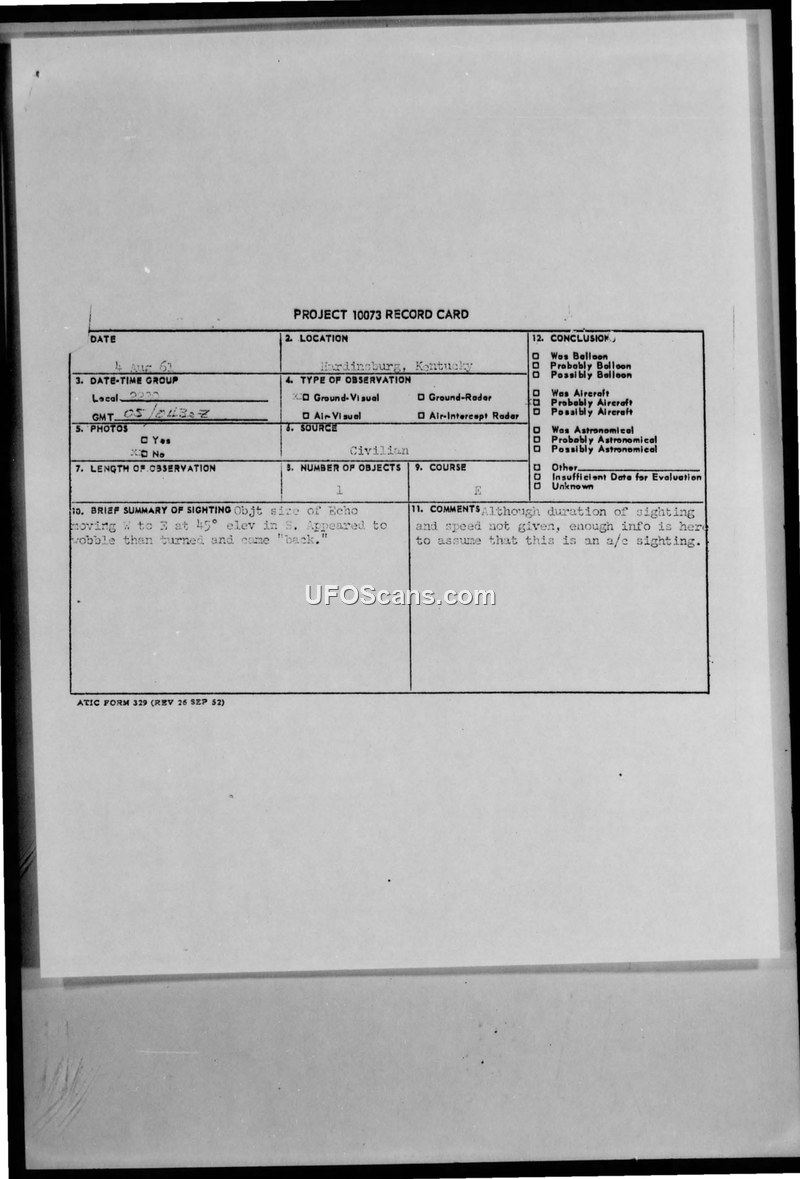 A 1961 sighting report from Hardinsburg, Kentucky, describes an object moving in a westerly to easterly direction. The military investigation concluded the object was a probable aircraft.