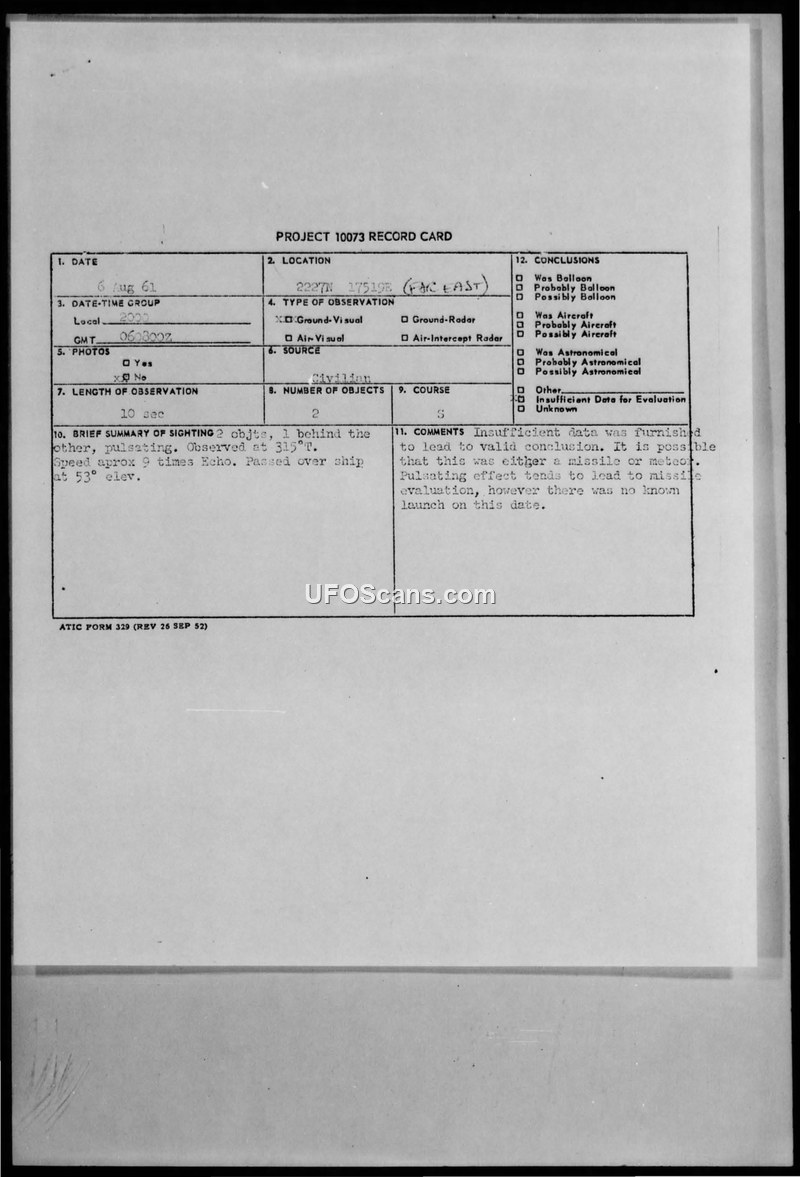 This document consists of a Project 10073 record card and associated correspondence regarding an unidentified aerial phenomenon reported on August 6, 1961. A witness, identified as a crew member of a United States Lines vessel, reported observing two pulsating objects while on watch at 2000 local time. The vessel was located at 22°27'N, 175°19'E, en route from Honolulu to Manila. The witness, accompanied by two able-bodied seamen, described the objects as moving in tandem, one behind the other, traveling from north to south. The observation lasted approximately 10 seconds, with the objects appearing at a sextant altitude of 53° - 26.5', which the witness noted was approximately the same height as the star Arcturus at that time. The witness estimated the speed of the objects to be nine times that of a U.S. satellite echo. The report was forwarded by the U.S. Navy Hydrographic Office to the National Aeronautics and Space Administration (NASA) and subsequently to the Foreign Technical Intelligence Center at Wright-Patterson Air Force Base. The official evaluation concluded that there was insufficient data to reach a definitive conclusion. While the possibility of a missile or a meteor was suggested, the report noted that there were no known missile launches recorded on that date. The pulsating nature of the objects was specifically cited as a characteristic that prompted consideration of a missile, though this remained speculative.