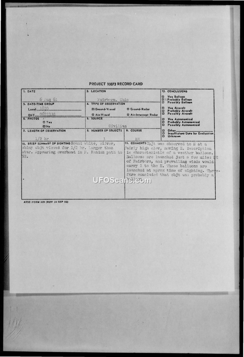 Project 10073 Record Cards and Technical Information Sheets — Fairborn, Ohio, August 1961