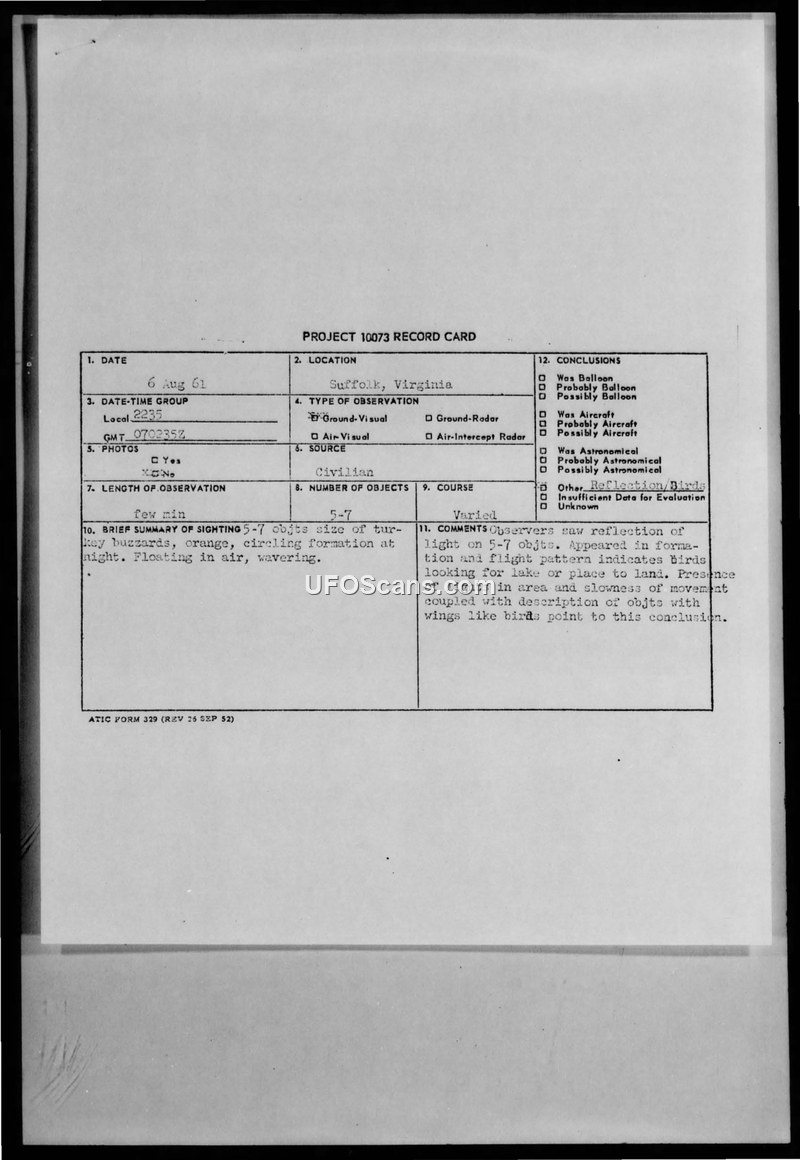 On August 6, 1961, at approximately 2235 local time, a couple in Suffolk, Virginia, observed five to seven unidentified objects in the sky. The witnesses, who were standing by their car due to mechanical trouble, described the objects as orange, two-bladed propeller-like shapes that appeared to be the size of a small watermelon when held at arm's length. The objects were initially seen in a 'V' formation before transitioning into a trail formation and circling in a clockwise manner for approximately two to three minutes. The witnesses reported that the objects had no sound, no exhausts, and no trails, but appeared to be wavering. An eight-year-old girl and her mother were also mentioned as witnesses, though they only observed the objects as they were disappearing to the North-east. Major Albert F. Houghton of the 4505 Air Refueling Wing conducted an investigation into the incident. He visited the residence of the primary witnesses on August 12, 1961, to gather further details. In his report, Major Houghton noted that the witnesses' home was located near a four-lane highway featuring brightly lit car dealerships and a 24-hour fruit market. The investigator concluded that the objects were likely birds reflecting the neon lights from these nearby commercial establishments. This conclusion was supported by the description of the objects' movement, which the investigator felt resembled birds looking for a place to land. The incident was documented in several communications, including an Air Intelligence Information Report (ARWOI 61-0001) and internal military messages, which requested further clarification on the size and elevation of the objects. The final assessment by the Air Technical Intelligence Center (ATIC) categorized the sighting as a reflection of light on birds.