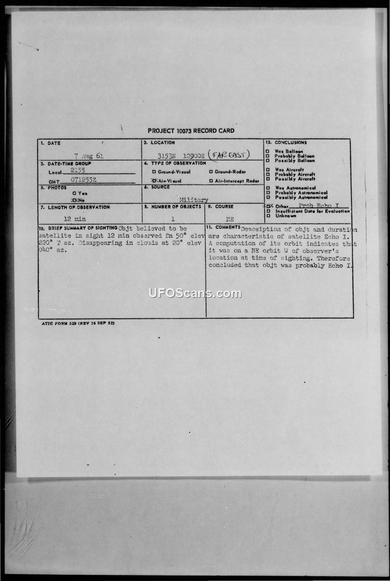A 1961 military sighting report of a bright object in the Far East was investigated under Project 10073. The object was officially identified as the Echo I satellite based on orbital trajectory analysis.