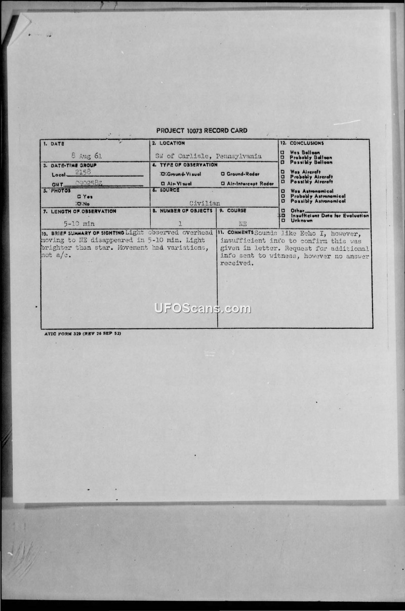 A group of witnesses in Carlisle, Pennsylvania, reported an erratic, bright light in the sky on August 8, 1961. The Air Force investigated the report under Project 10073 but concluded there was insufficient data to confirm the object's identity, despite a suspicion it might be the Echo I satellite.