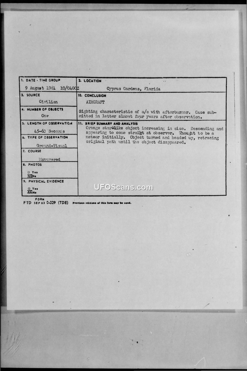 A civilian witness reported a 1961 UFO sighting in Florida to the Air Force in 1965. The Air Force concluded the object was likely a jet aircraft with an afterburner, citing the difficulty of investigating reports submitted years after the event.