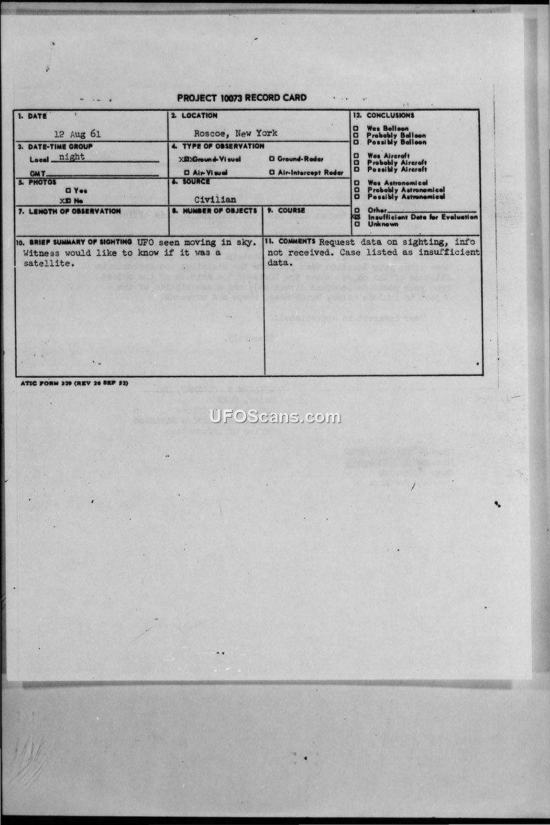 A 1961 UFO sighting in Roscoe, New York, was investigated by the Air Force under Project 10073. The case was closed as 'insufficient data' after the witnesses failed to provide requested follow-up details.