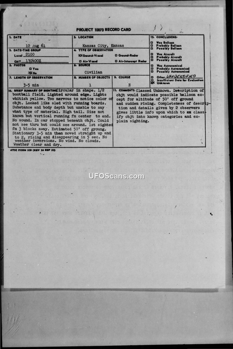 Project 10073 Record Card — Kansas City, Kansas, 12 August 1961