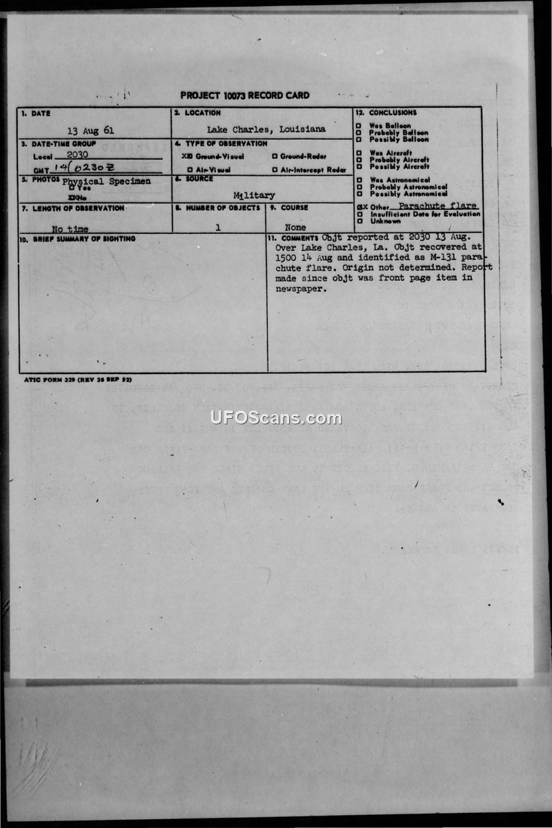 A reported UFO sighting in Lake Charles, Louisiana, on August 13, 1961, was investigated by the Air Force. The object was recovered the following day and identified as an M-131 parachute flare.