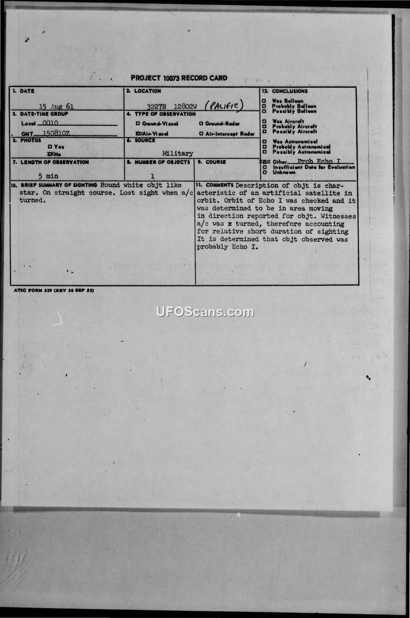 Project 10073 Record Card - Sighting Report 15 Aug 61