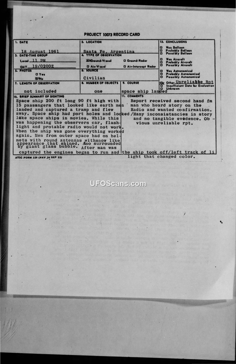 A second-hand report of a UFO landing and human abduction in Argentina was submitted to the U.S. Air Force in 1962. The Air Force dismissed the account as unreliable due to a lack of evidence and inconsistencies.