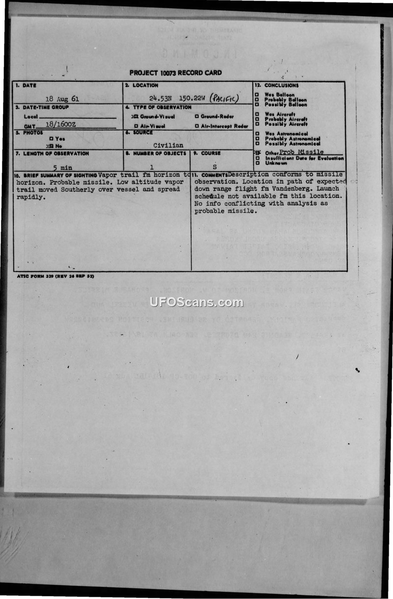 A civilian report of a vapor trail in the Pacific on August 18, 1961, was investigated by the Air Force. The phenomenon was officially classified as a probable missile consistent with flight paths from Vandenberg AFB.