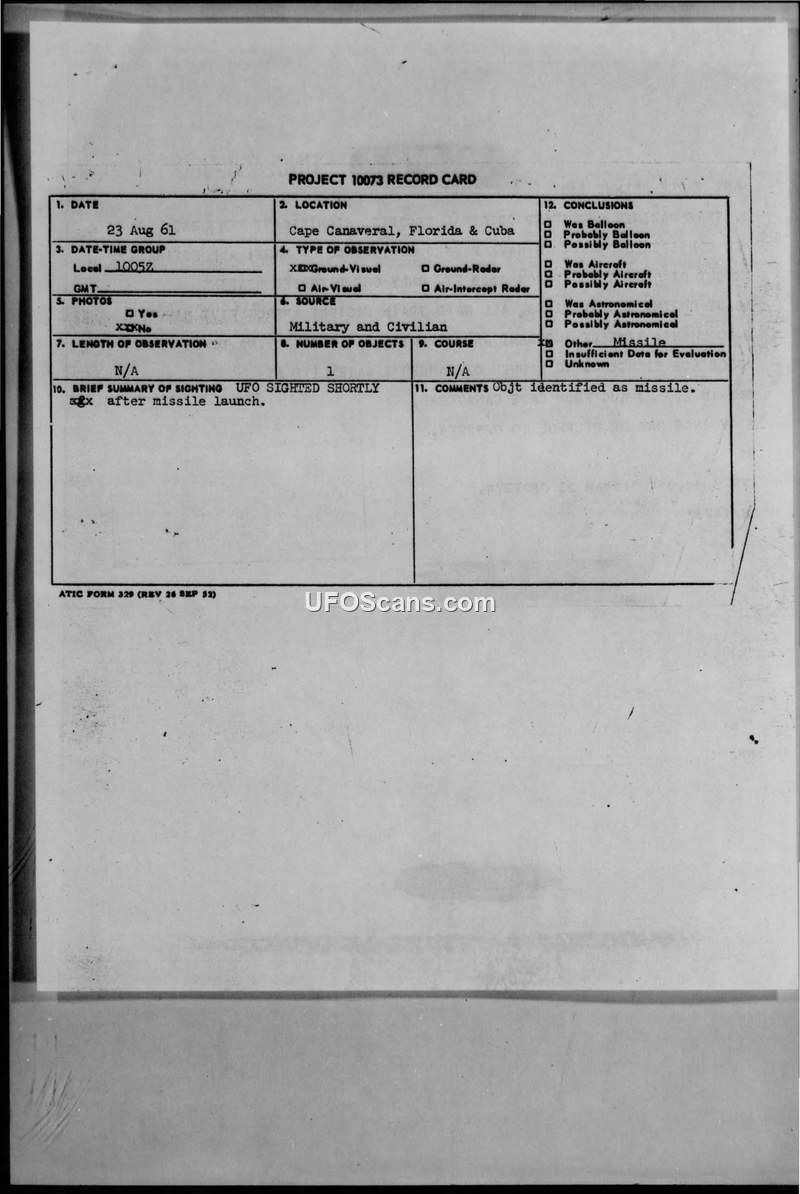 Project 10073 Record Card and Related Correspondence — Cape Canaveral, August 1961