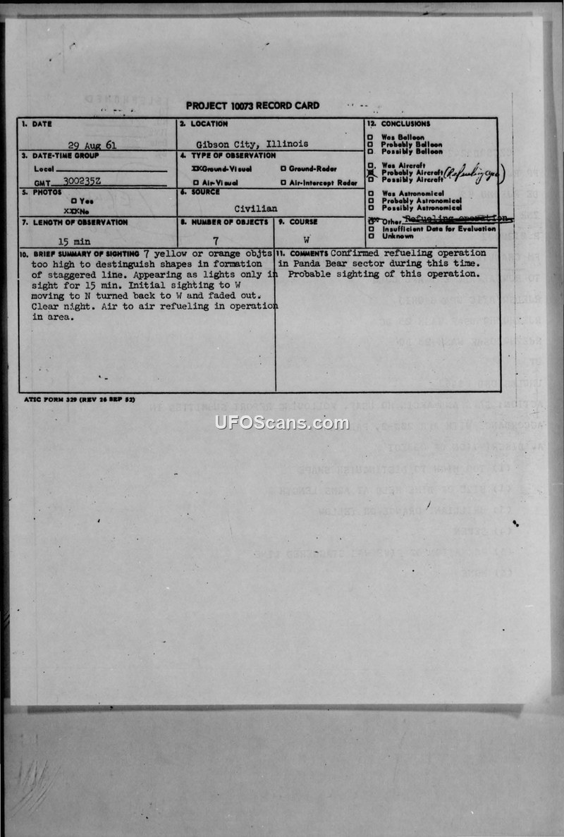 Civilians reported seven unidentified lights over Gibson City, Illinois, on 30 August 1961. The military concluded the sighting was likely related to air-to-air refueling operations in the area.