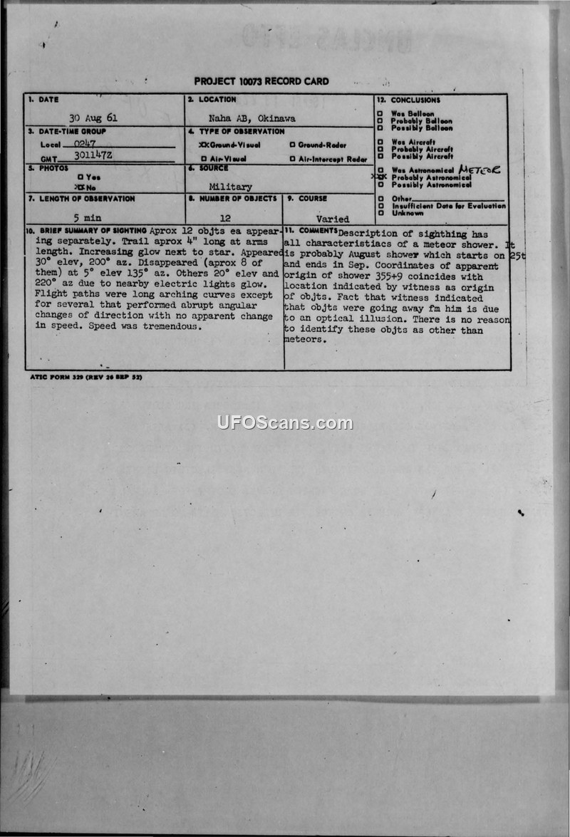 A 1961 sighting of 12 objects over Naha AB, Okinawa, was investigated by the Air Technical Intelligence Center (ATIC). The official conclusion identified the phenomena as a meteor shower.