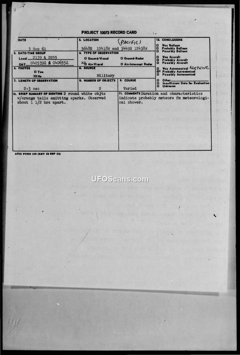 USAF personnel reported two round, white objects with orange tails over the Pacific on September 3, 1961. The Air Force concluded the objects were likely meteors from a meteorological shower.