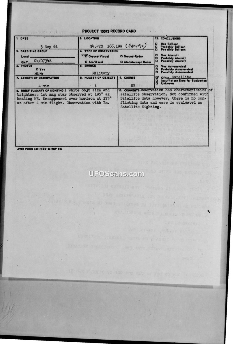 On September 3, 1961, at 040734Z, a white object of first-magnitude brightness was observed by personnel aboard a NAVAIR/SAR ship located at 34-47N, 166-19.5W. The sighting lasted for four minutes. The object was initially spotted at an elevation of ten degrees, bearing 195 degrees, and was observed moving in a northeasterly direction. It eventually disappeared over the horizon at a bearing of 175 degrees. The observation was conducted visually using binoculars. The sighting was reported by a Seaman (SN) named Zumdahl and was subsequently confirmed by the Officer of the Deck (OOD) and five other watch standers, all of whom were considered reliable witnesses. The weather conditions at the time were reported as CAVU (Ceiling and Visibility Unlimited). The incident was documented in a Project 10073 record card and a formal MERINT report transmitted by the Hawaii Air Defense Division at Kunia Annex. The official evaluation of the incident concluded that the object exhibited the characteristics of a satellite. Although the report notes that the sighting was not explicitly confirmed by satellite tracking data, the absence of conflicting information led to the final classification of the event as a satellite sighting.