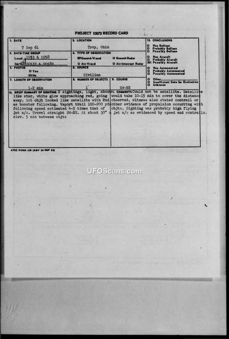 This document is a Project 10073 record card detailing a sighting of two unidentified aerial objects over Troy, Ohio, on September 7, 1961. The witness, who identified himself as a weather man with 15 years of experience, reported observing two objects traveling from the southwest to the northeast. The first object was described as having a white glow, appearing like a satellite, with a second object following it like a booster. The witness noted that the objects appeared red as they moved away and left a vapor trail approximately 100-200 yards behind them. The witness estimated the speed of the objects to be four to five times that of a jet fighter and their altitude to be between 100,000 and 150,000 feet. The sighting lasted for one to two minutes, with a five-minute interval between the two objects. The witness explicitly stated that the vapor trail did not spread out like that of a typical aircraft. Despite the witness's professional background in weather observation, the official conclusion recorded on the card is that the sighting was likely high-flying jet aircraft, based on the speed and the presence of contrails. The document includes a completed U.S. Air Force Technical Information Sheet, where the witness provided sketches and detailed responses regarding the objects' appearance, motion, and the environmental conditions at the time of the sighting. A note on the summary data sheet indicates that the witness continued to look for the objects after the initial sighting but reported negative results.