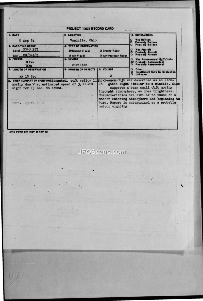 Project 10073 Record Card — Vandalia, Ohio, 8 Sep 61