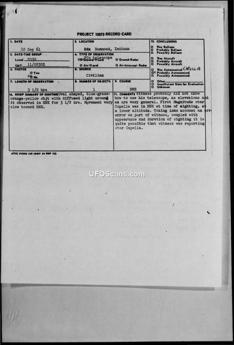 Project 10073 Record Card and Incident Report — Hammond, Indiana, 10 Sep 61