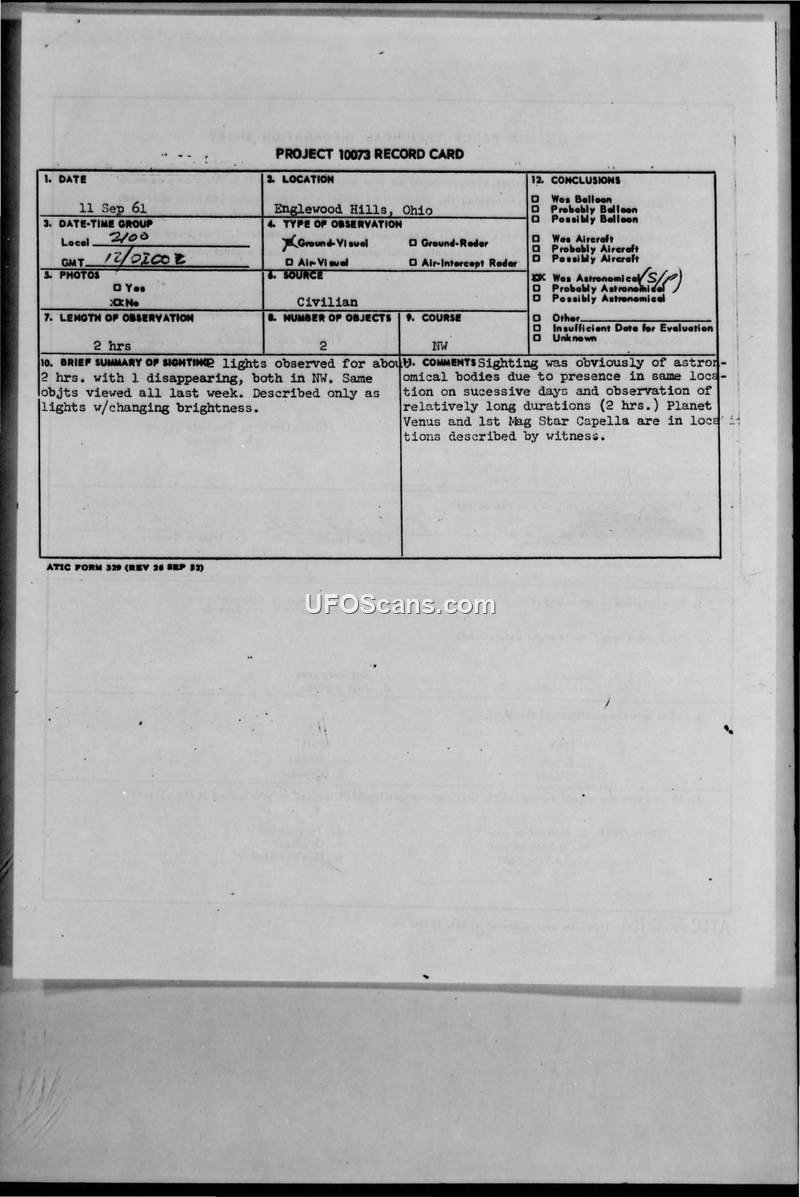 Project 10073 Record Card — Englewood Hills, Ohio, 11 Sep 61