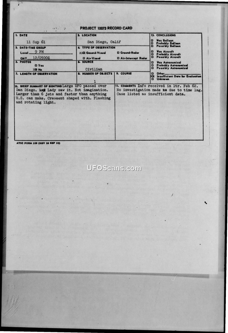 This document consists of a Project 10073 Record Card and a subsequent letter of complaint from a civilian witness. The record card documents a sighting on September 11, 1961, in San Diego, California, where a witness reported a large, crescent-shaped object with flashing and rotating lights that appeared larger than six jets and moved at speeds exceeding U.S. capabilities. The official conclusion recorded on the card is 'Insufficient Data for Evaluation,' noting that no investigation was conducted due to a time lag in receiving the report. The accompanying letter, dated February 20, 1962, is written by a civilian who expresses deep dissatisfaction with the Department of Defense's handling of UFO reports. The author criticizes the Air Force's news release (DOD Release No. 179-62) for its dismissive tone toward civilian witnesses and its categorization of sightings as 'astronomical' or 'insufficient data.' The author argues that the Air Force contradicts itself by claiming UFOs are unimportant while simultaneously issuing lengthy reports and instructing citizens to report sightings to military bases. The letter highlights the author's own sighting in San Diego, reiterating the details of the crescent-shaped object and challenging the Air Force's tendency to attribute such reports to weather balloons, flares, or mass hallucinations. The author concludes by questioning the transparency of the government's UFO reporting process and suggesting that the public is being treated like 'idiotic children.' The document reflects the tension between civilian observers and military authorities regarding the investigation and public disclosure of UAP incidents during the early 1960s.