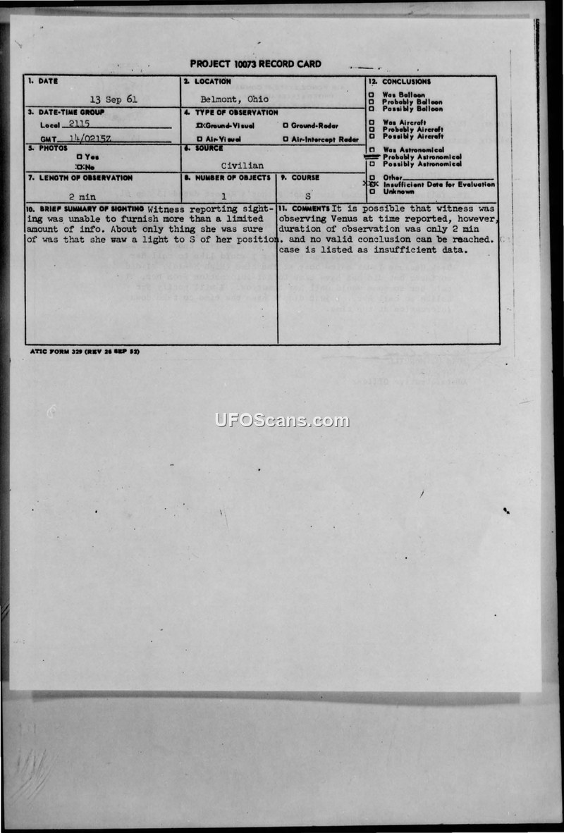 PROJECT 10073 RECORD CARD - Belmont, Ohio - 13 Sep 61