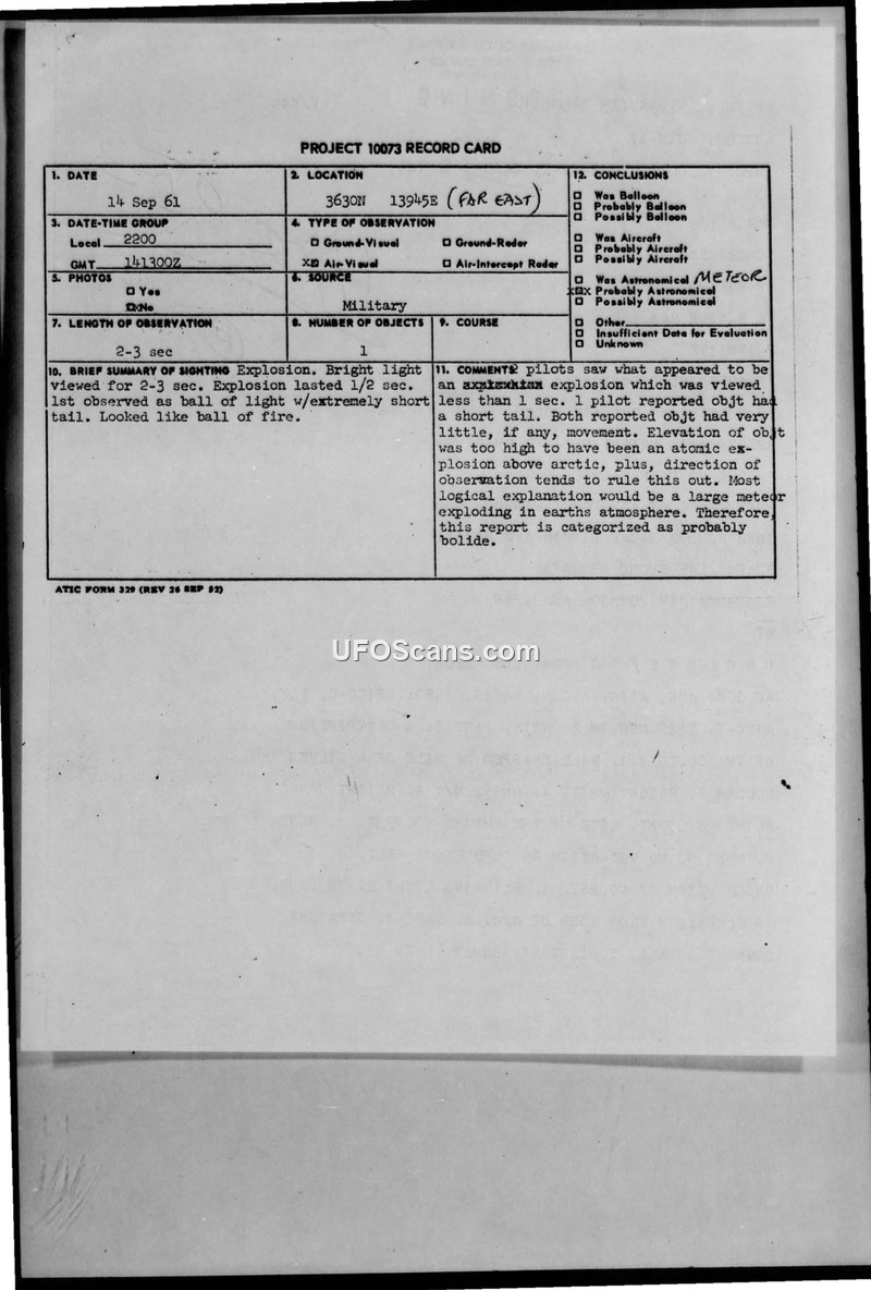 Two USAF pilots reported a bright, blinding aerial explosion at 35,000 feet over Japan in 1961. The Air Force officially categorized the event as a probable bolide (meteor).