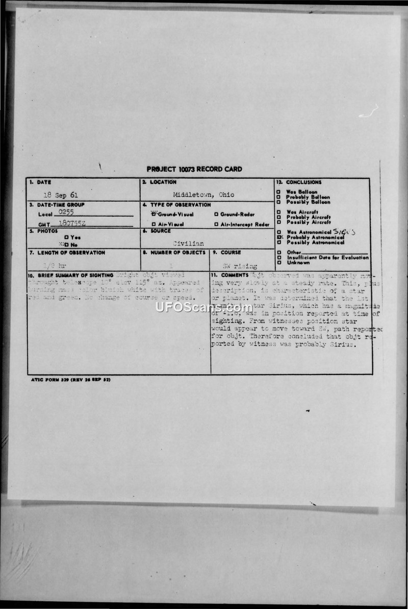 Project 10073 Record Card — Middletown, Ohio, 18 Sep 61