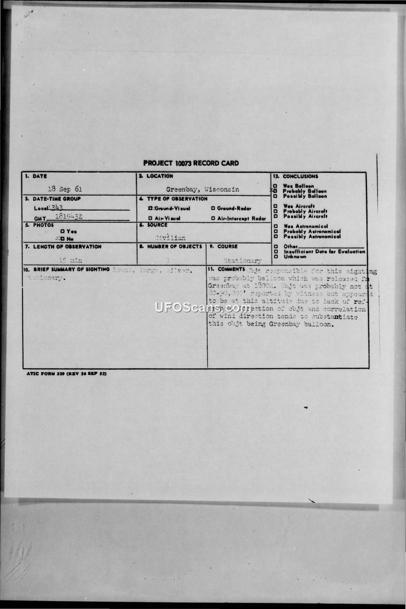This document contains a Project 10073 record card and subsequent internal correspondence regarding a UFO sighting reported on September 18, 1961, in the vicinity of Greenbay, Wisconsin. The witness, identified as a civilian, reported observing a large, round, silver object that remained stationary for approximately 15 minutes. The object was estimated to be at an altitude of 80,000 to 90,000 feet. An incoming teletype message (TWX) from Truax Field, Wisconsin, provided further details, noting the object's unusual appearance and its position 50 miles north of Milwaukee. Following the report, Colonel Edward H. Wynn of the Foreign Technology Division requested a review of the sighting. In response, Colonel Paul J. Slocum of the Electronics Division evaluated the data, noting that the object's relatively low speed, high altitude, and erratic course—which included hovering—ruled out a conventional aircraft. Colonel Slocum concluded that the evidence favored a weather balloon and suggested that further investigation should focus on verifying weather balloon launch activities in the area. The documentation includes the original record card, the incoming teletype message, and the internal memoranda between the Foreign Technology Division and the Electronics Division.