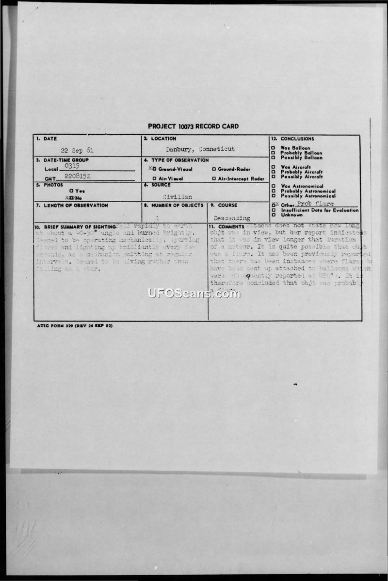 A civilian reported a bright, descending object in Danbury, Connecticut, on September 22, 1961. Air Force investigators concluded the object was likely a flare attached to a balloon.
