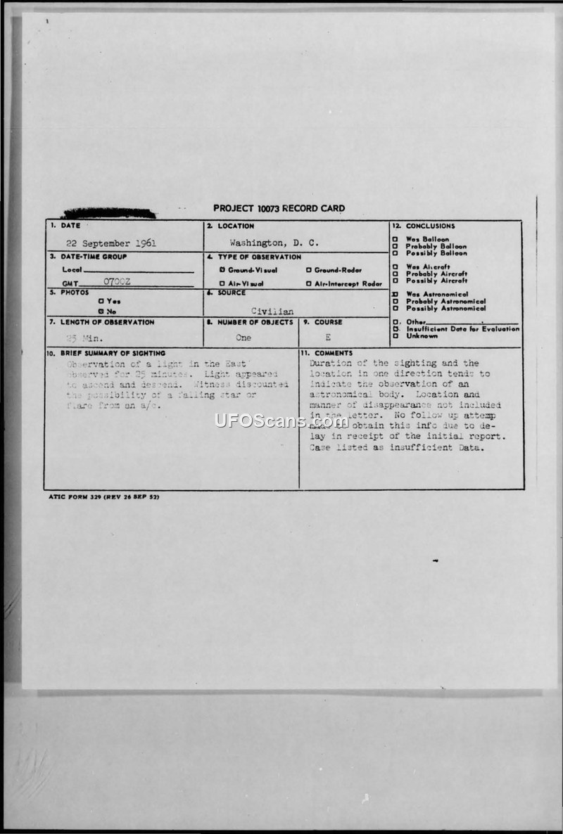 PROJECT 10073 RECORD CARD — 22 September 1961