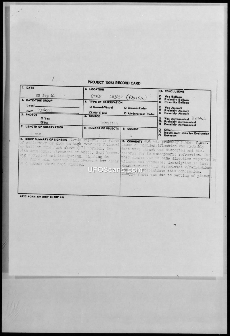 Project 10073 Record Card and Naval Message — Sighting Report 22 Sep 61